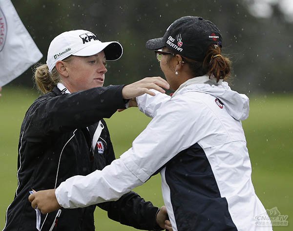 “我真的以为我们可以打完,”史黛西-路易斯说,“可是当我们来到第七洞的时候,雨开始下得很大。当冰雹落下来的时候,我们不得不叫住高宝璟,让她不要再推杆了。”