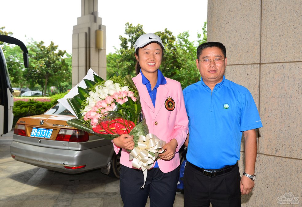 今天刚刚来到无锡锦园,她便感受到了不一样的气氛。在会所门口,冠名赞助商代表,常熟史力胜体育用品贸易有限公司副总经理西口俊博以及承办球会代表,无锡锦园高尔夫球会总经理金雪迎上前去,为她送上鲜花,披上冠军茄克。