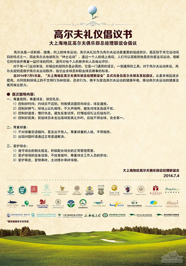 大上海地区高尔夫俱乐部总经理联谊会现决定在大上海地区以统一姿态向广大球友倡议尊重高球礼仪,推广高球文化,为广大球友创造更好、更和谐的打球环境。